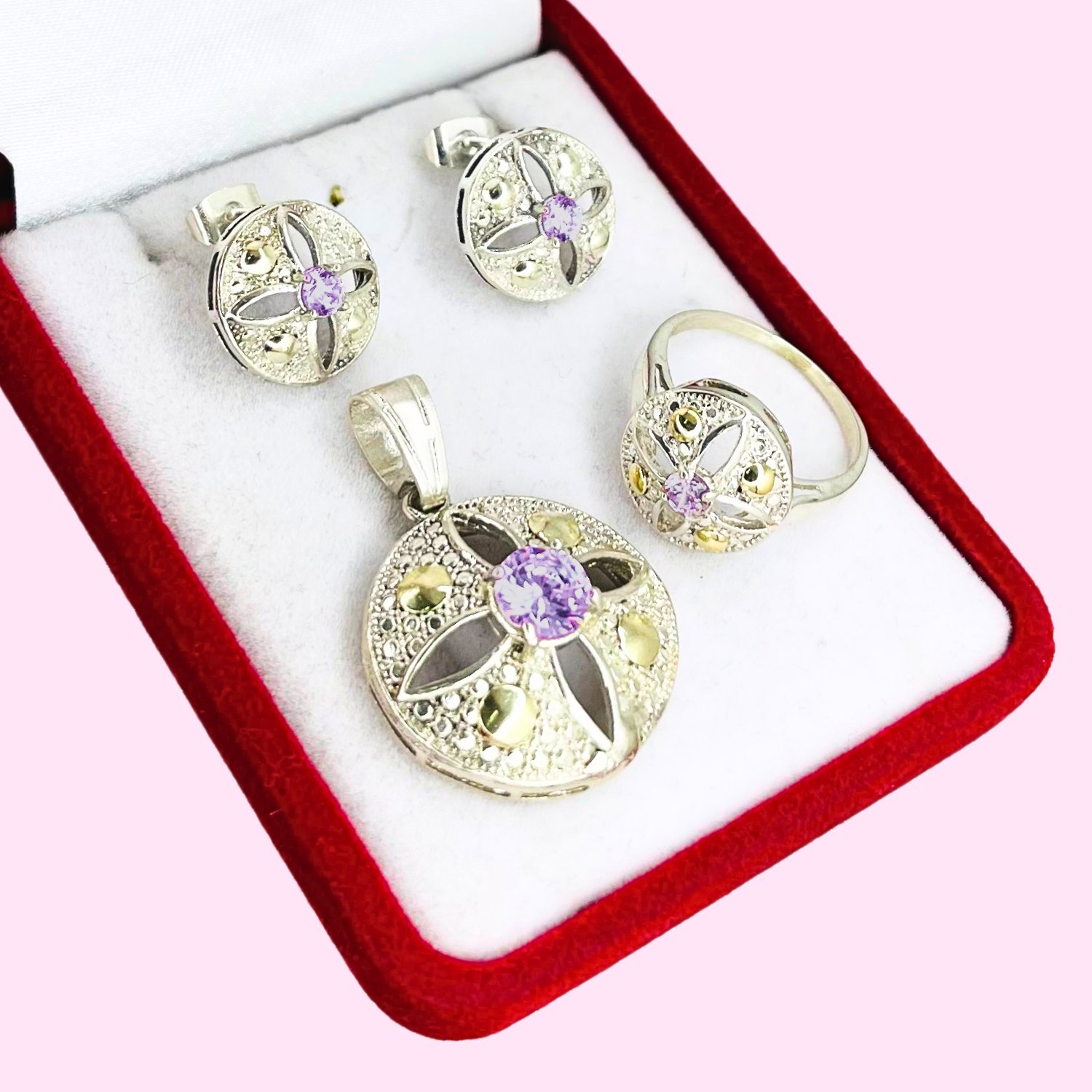 Conjunto Imperial Dije - Anillo y aros con cubic Violeta Plata y Oro