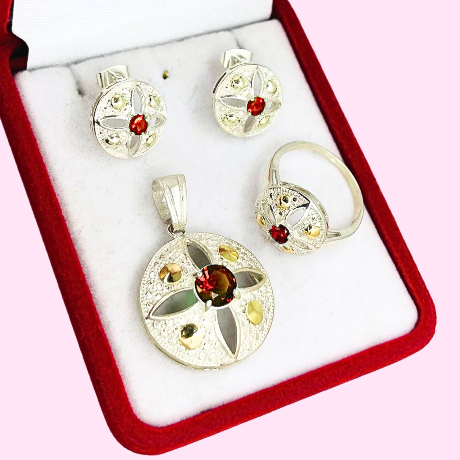 Conjunto Imperial Dije - Anillo y aros con cubic Rojo Plata y Oro