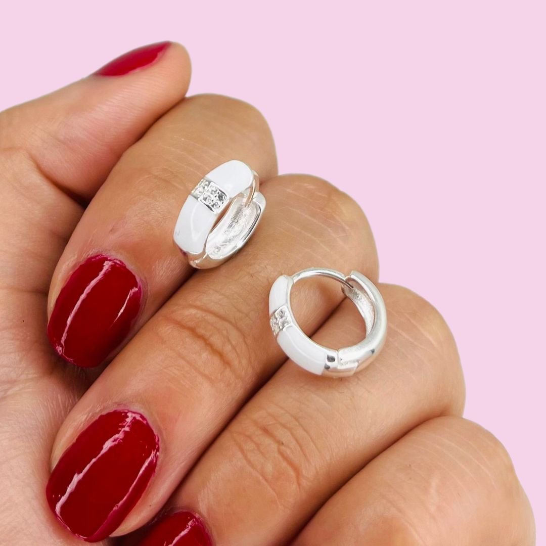 Aros Huggies blanco esmaltado y micropave Plata 925