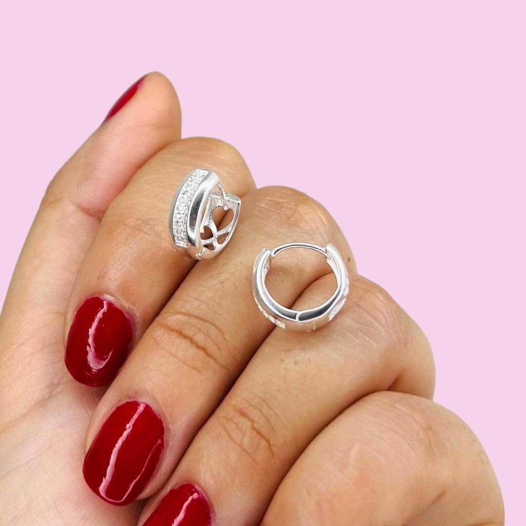 Aros Huggies micropave y corazon calados blanco Plata 925