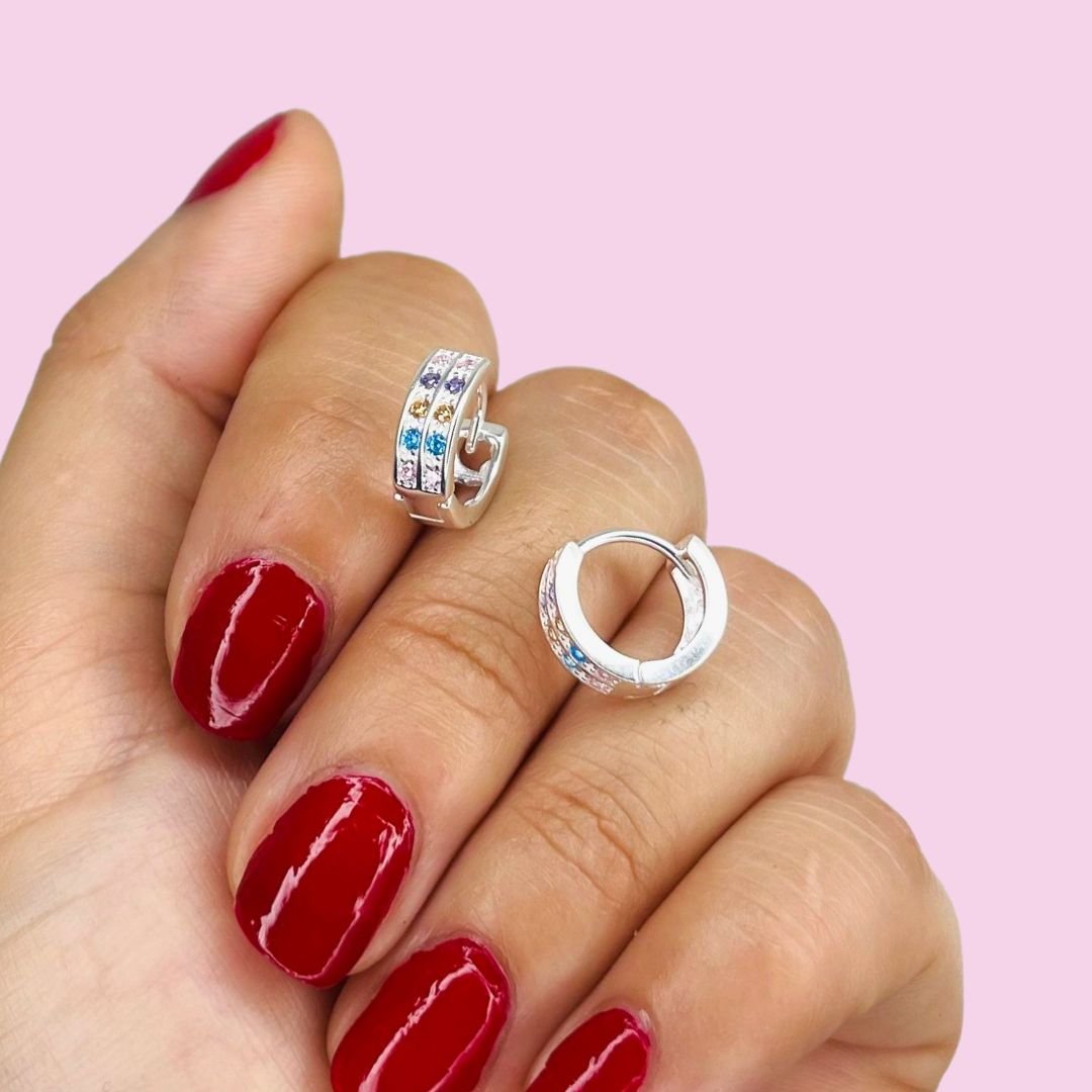 Aros Huggies Multicolor con corazones calados micropave blanco Plata 925