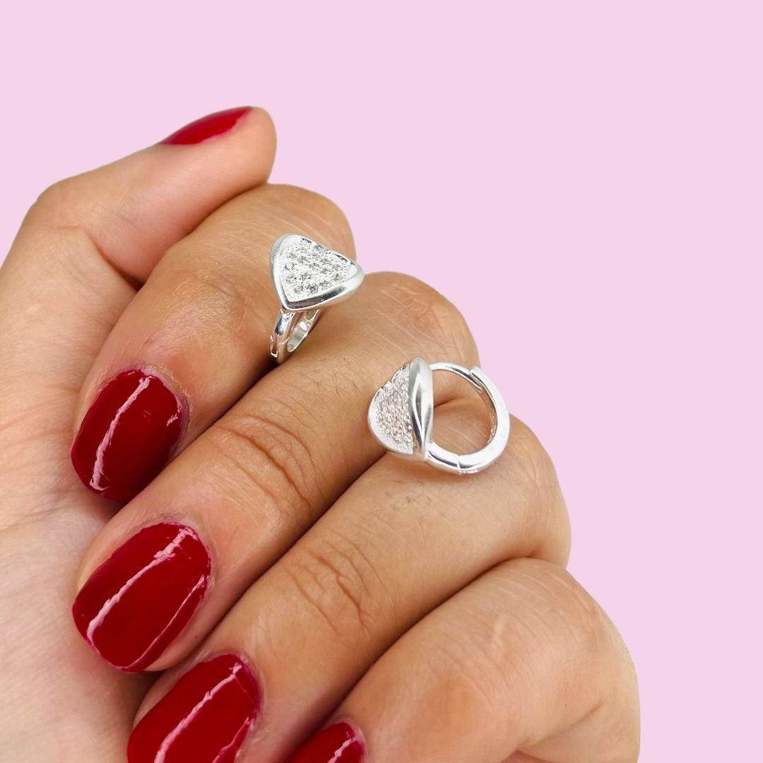 Aros Huggies corazon relieve y micropave blanco Plata 925
