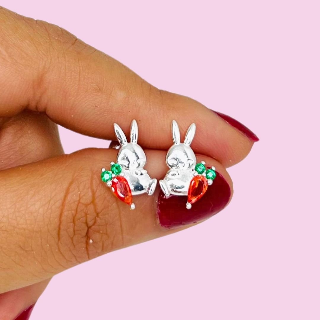 Aros piercing Conejo con zanahoria con cubic Plata Italiana