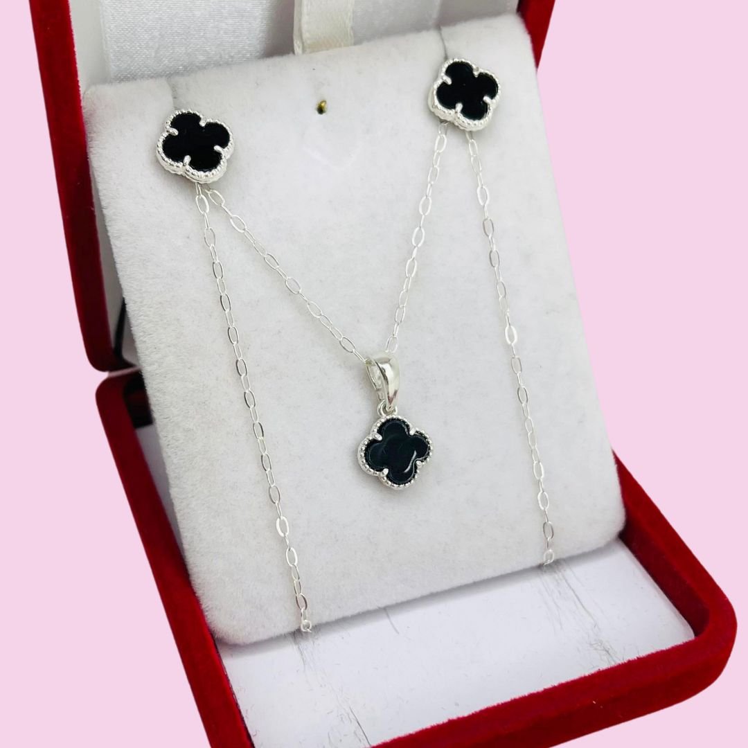Conjunto Cadena con dije y aros Van cleef Negro Plata 925