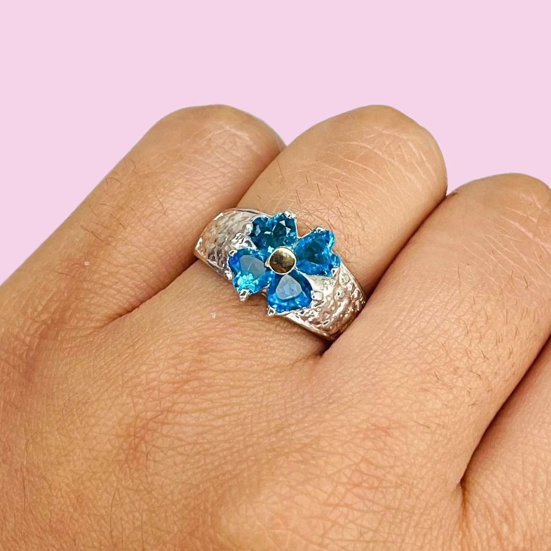 Anillo Trebol Aguamarina Plata y Oro