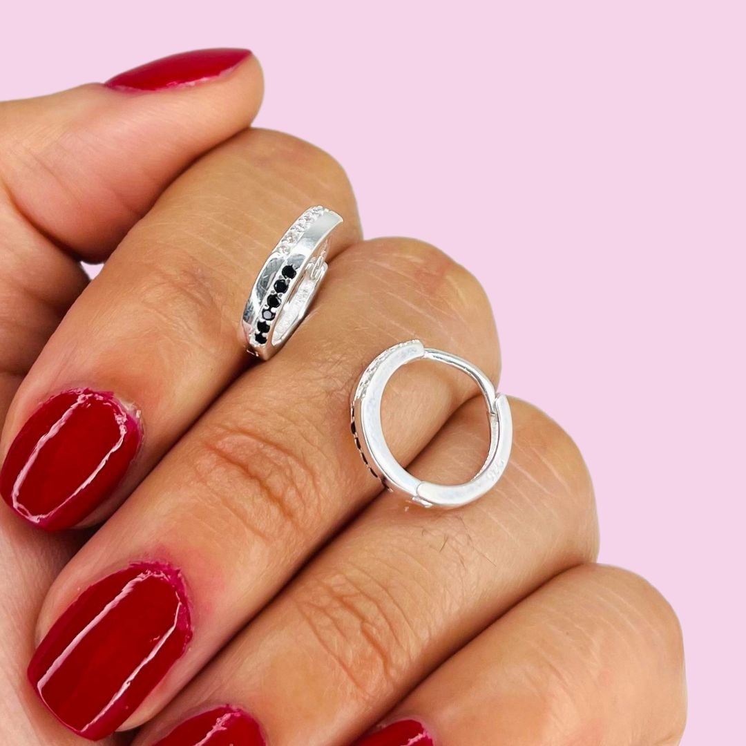 Aros Huggies Micropave blanco y negro Plata Italiana