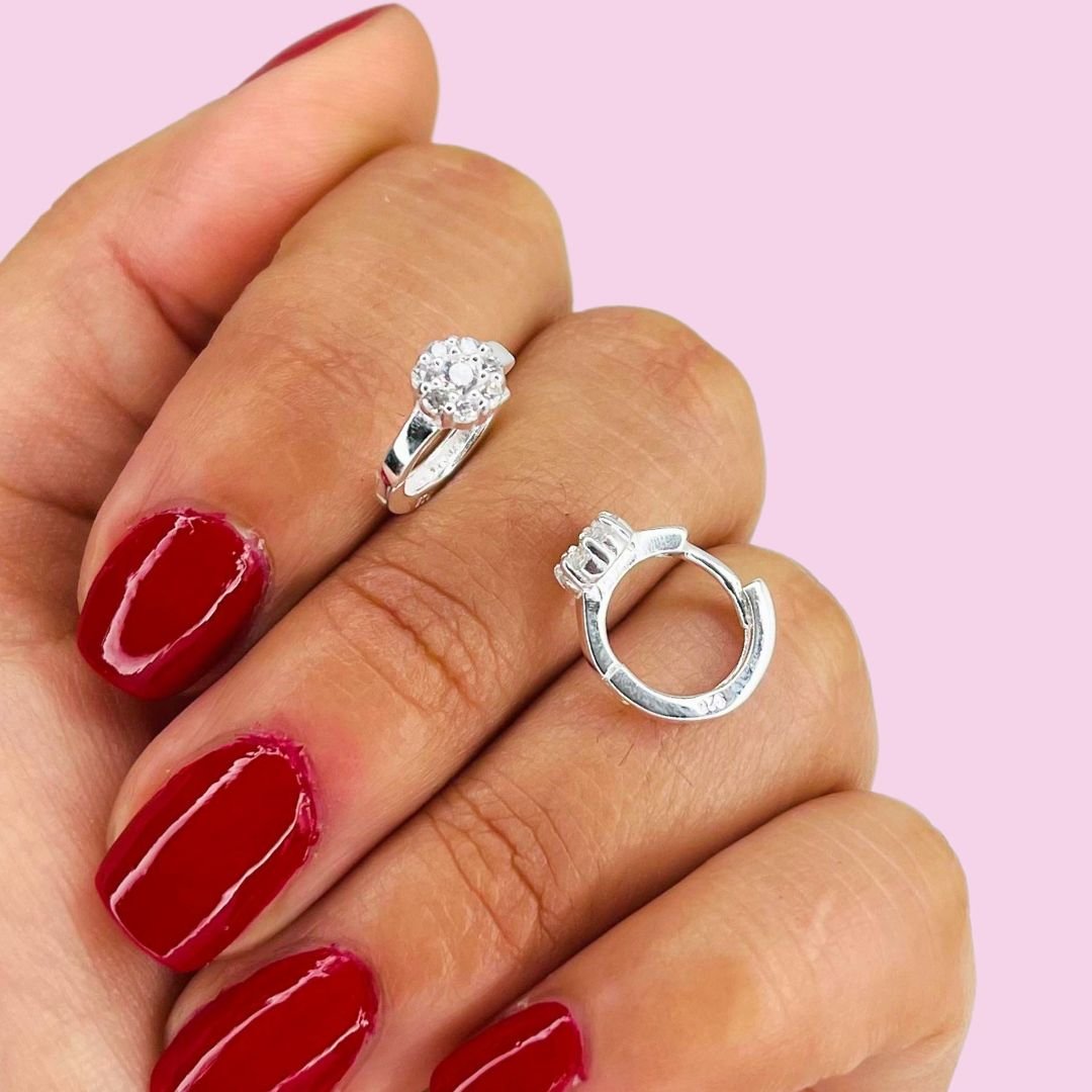 Aros Huggies Flor cubic blanca Plata Italiana