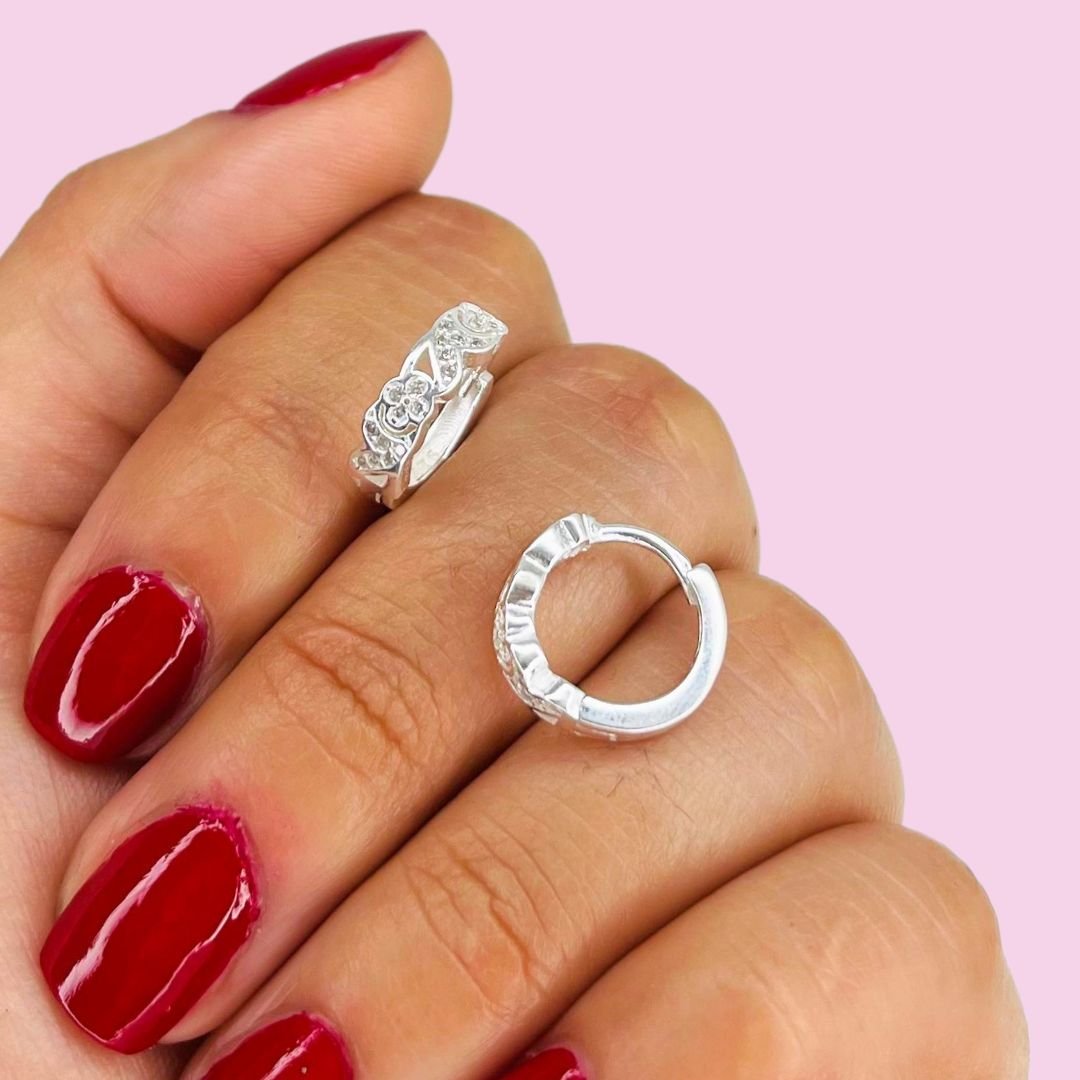 Aros Huggies trebol en micropave blanca Plata Italiana