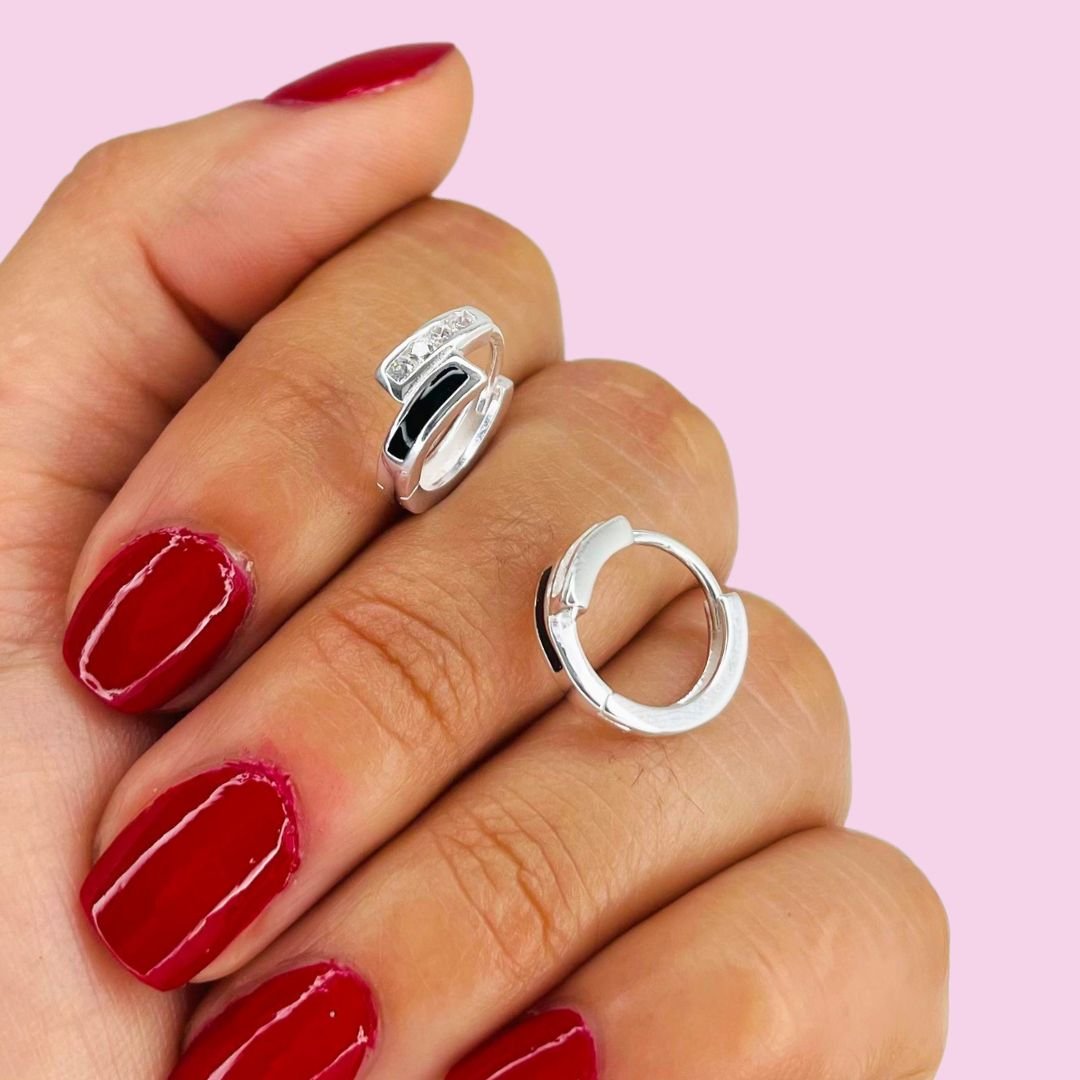 Aros Huggies Cruzado Cubic con esmaltado Negro Blanco Plata Italiana