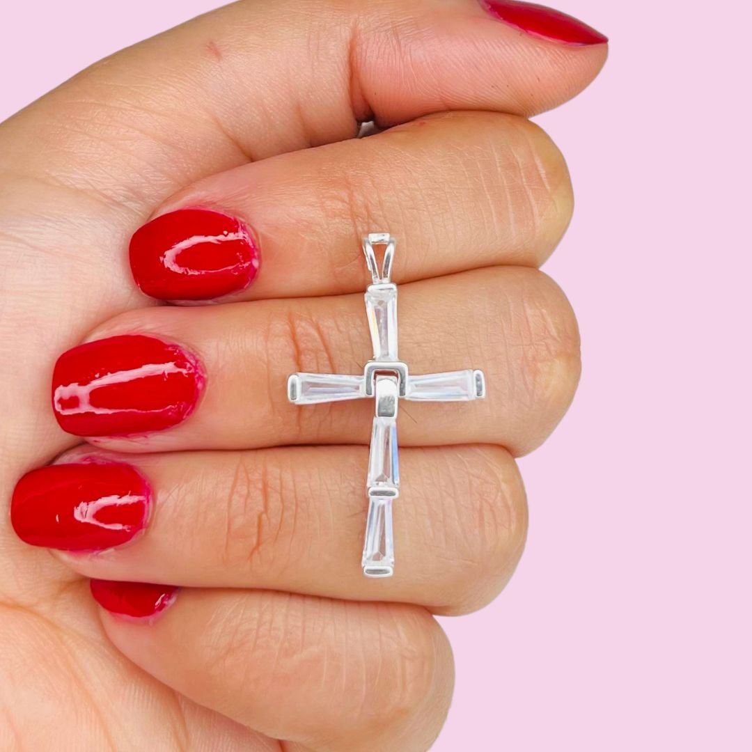 Dije Cruz Baguette movible Blanco Plata Italiana