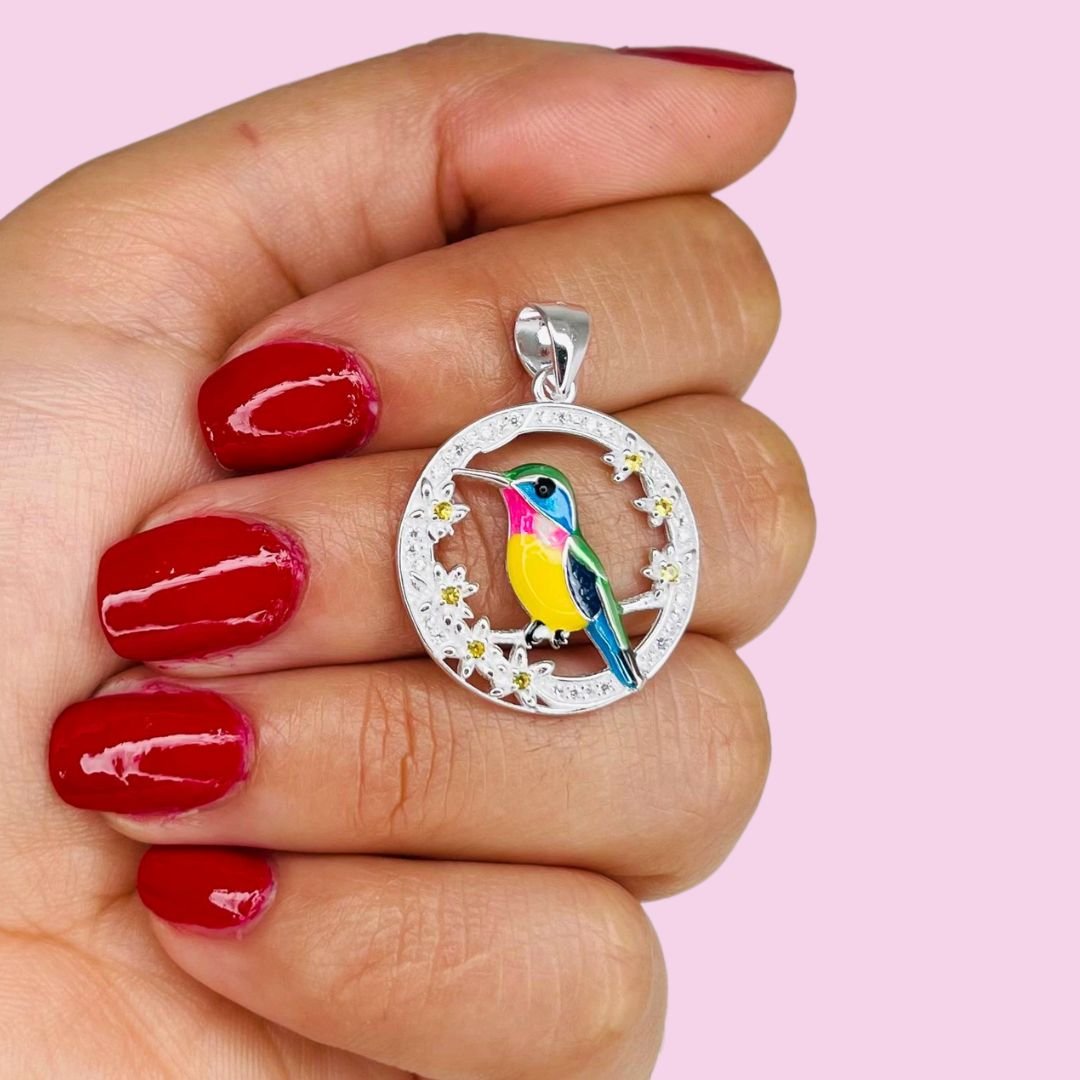 Dije Colibri con flores cubic y esmaltado Plata Italiana