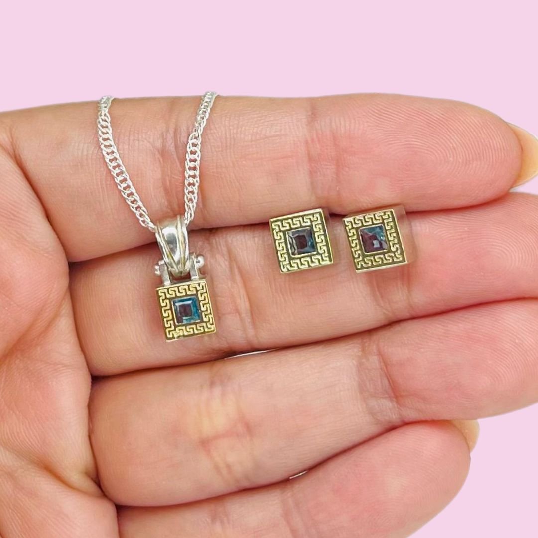 Artículo: KIT 328-5Conjunto Cadena dije y aros Guarda Griega Aguamarina Plata 925 y Oro