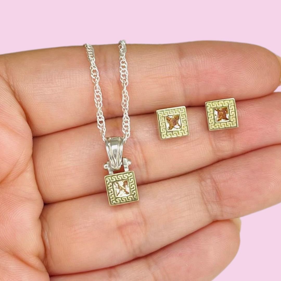 Conjunto Cadena dije y aros Guarda Griega Ambar Plata 925 y Oro