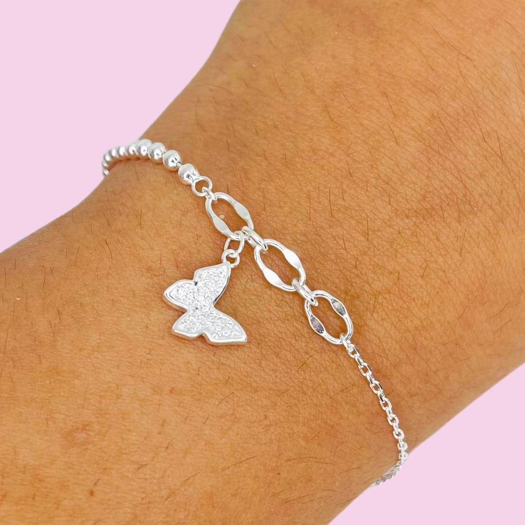 Artículo: PS 394Pulsera trio (bolita, forcet, rolo) y mariposa con micropave Plata Italiana