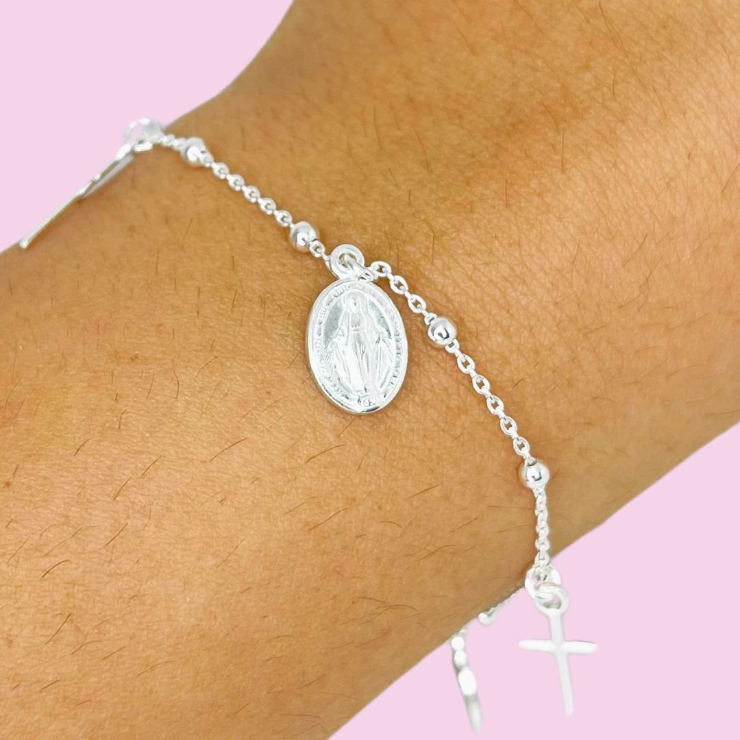 Pulsera Virgen Medalla Milagrosa y Cruz Plata Italiana