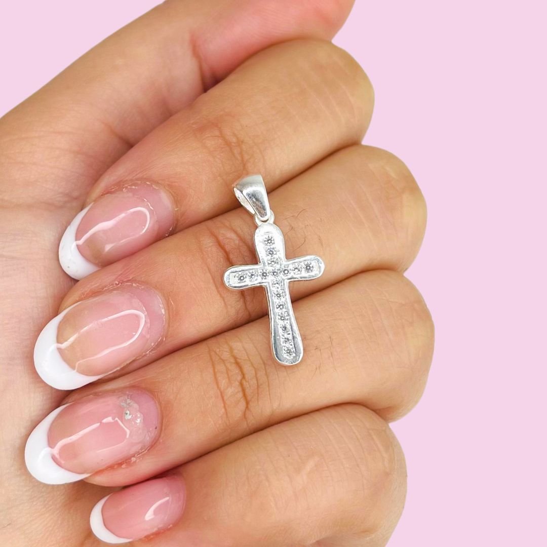 Dije Cruz puntas redondas con micropave blanco Plata Italiana