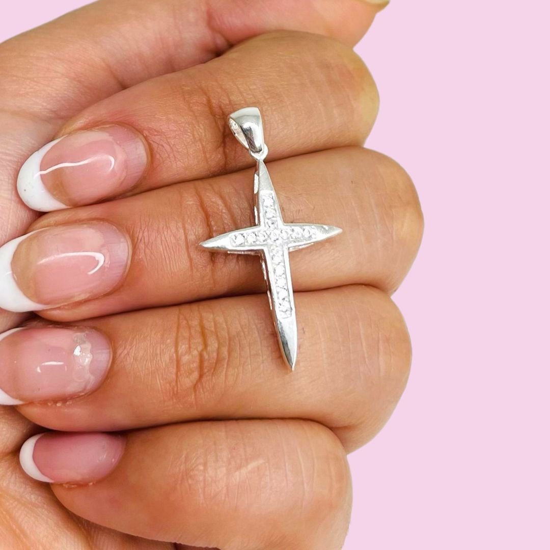 Dije Cruz puntas finas con micropave Plata Italiana