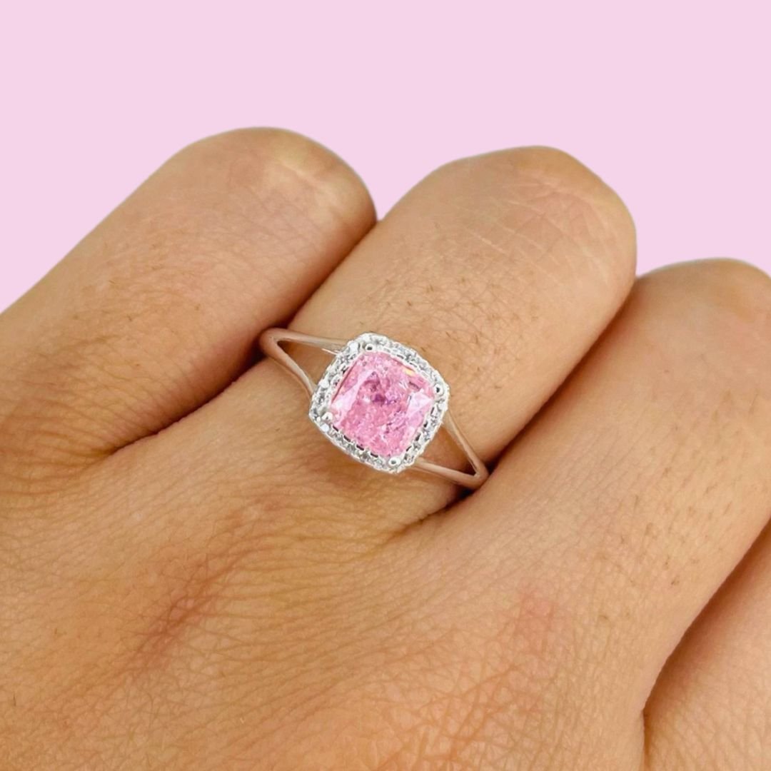 Anillo Compromiso cubic cuadrado Rosa y micropave Plata Italiana