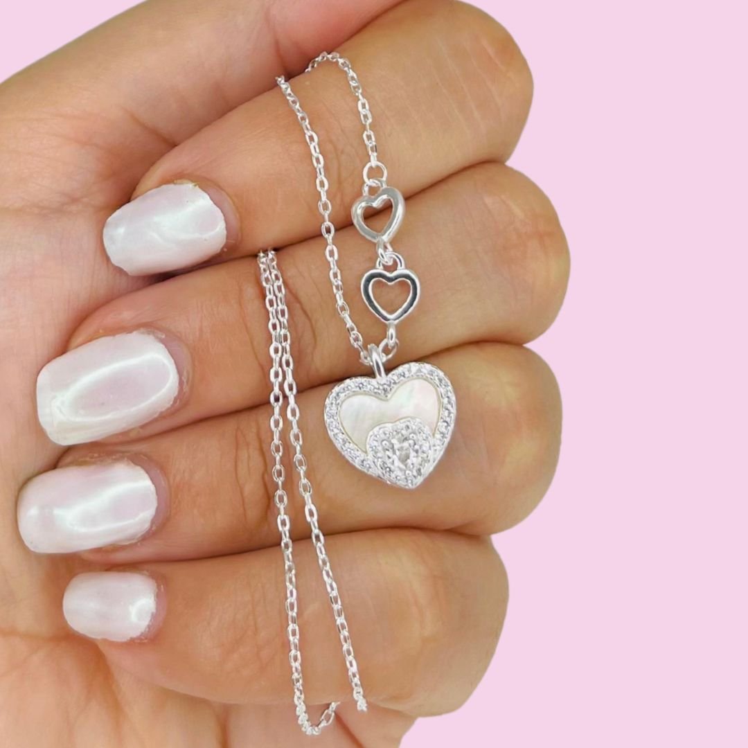 Conjunto Corazon Nacar con cubic y micropave blanco Plata Italiana