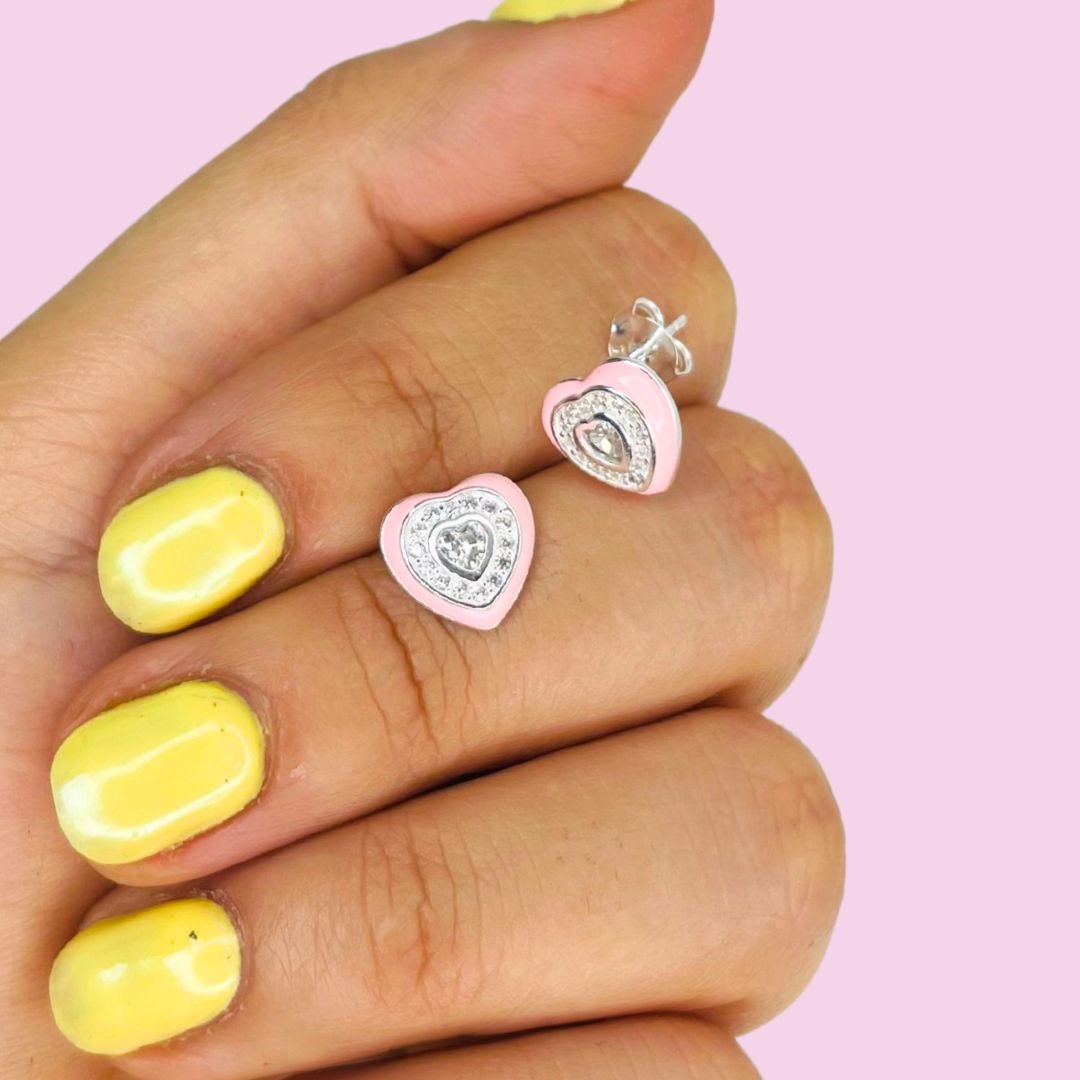 Aros Corazon esmaltado con cubic Rosa Plata 925