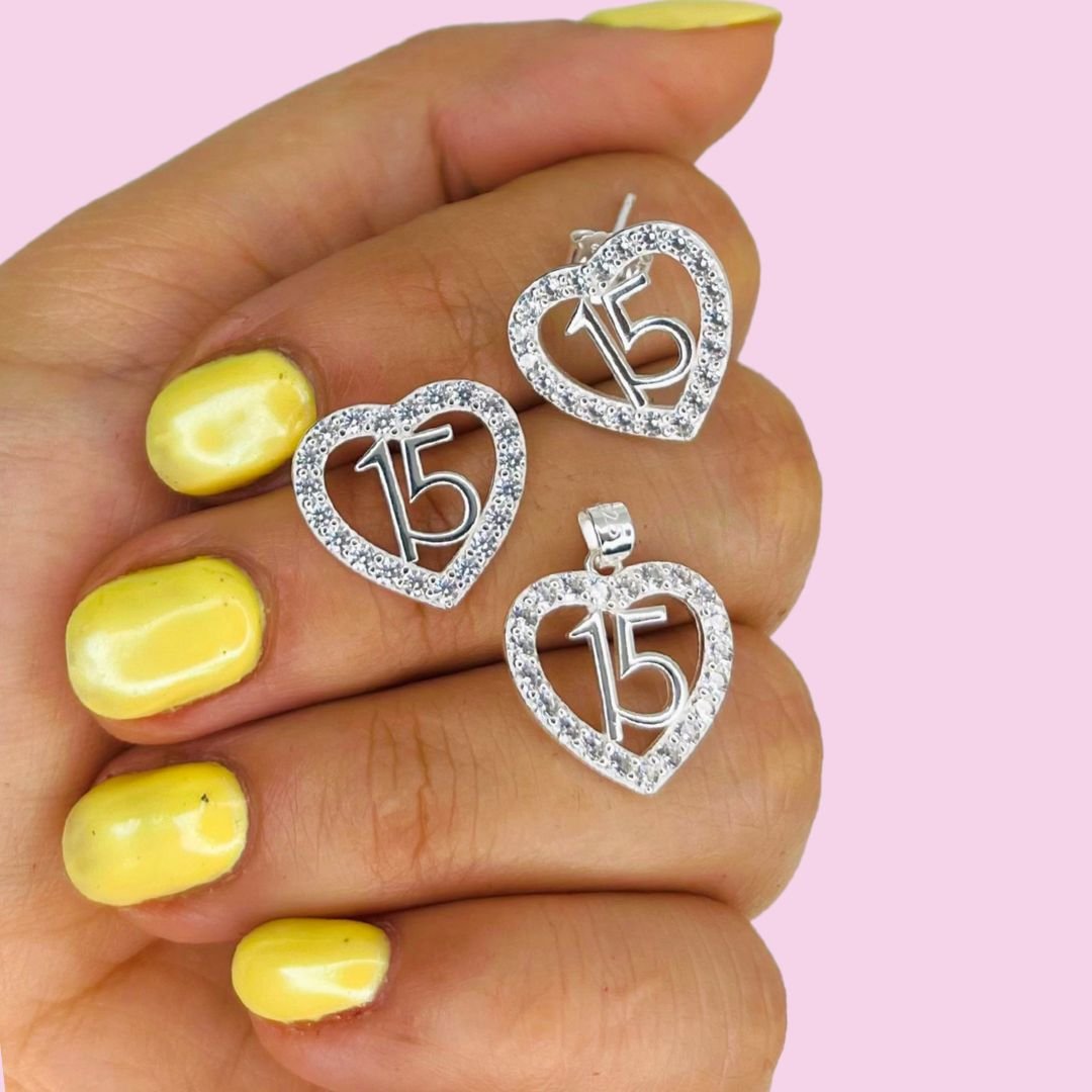Artículo: KIT 343Conjunto Aros y dije corazon quinceaños Plata Italiana
