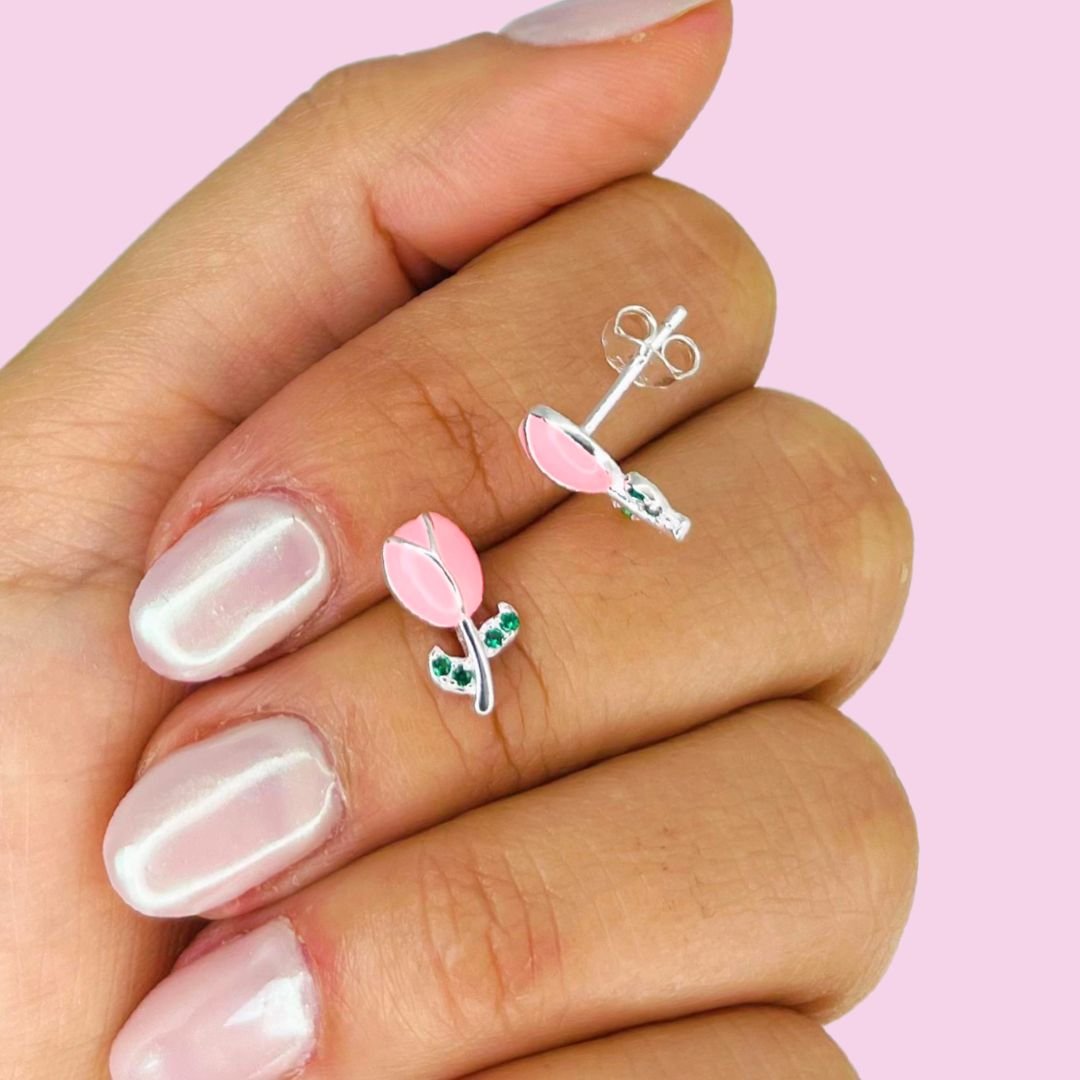 Aros Esmaltado Tulipan Rosa Plata Italiana