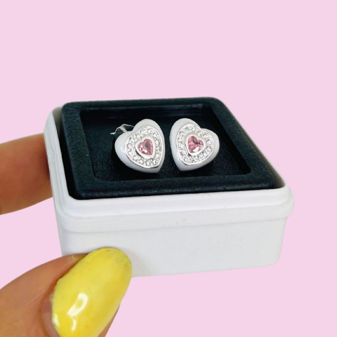 Aros Corazon esmaltado blanco con cubic Rosa Plata 925
