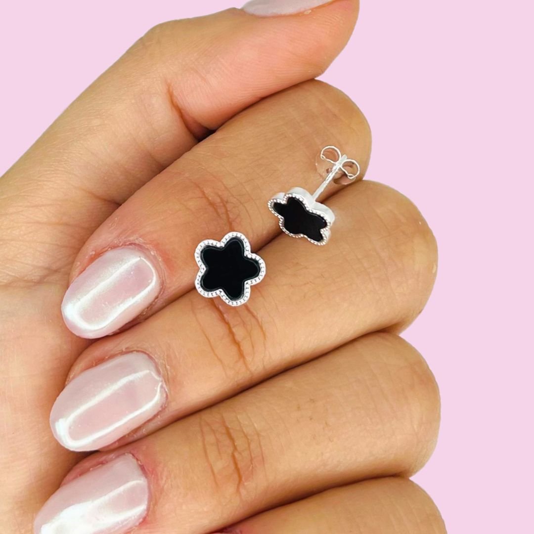 Aros Flor onix Negro Plata Italiana
