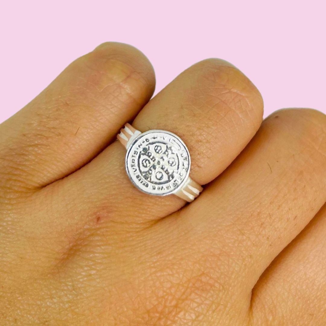 Anillo San Benito clasico cuerpo rallado de Plata 925