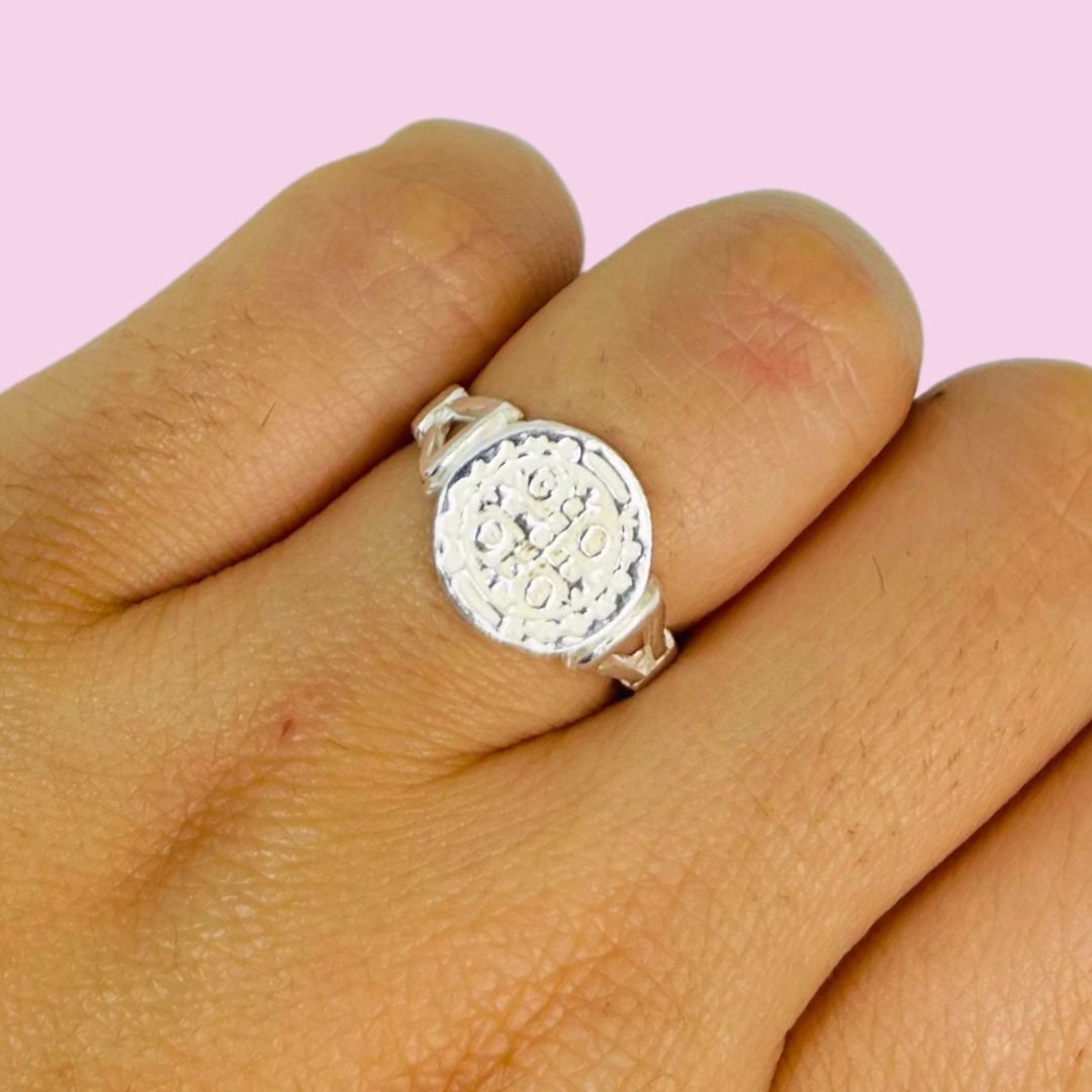 Anillo San Benito Redondo calado fino de Plata 925