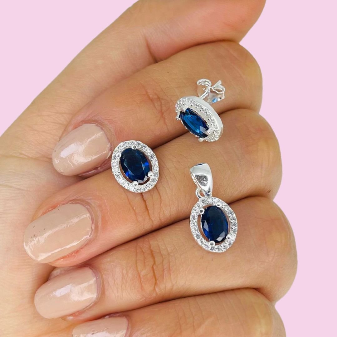 Conjunto Aros y Dije Ovalado Azul Plata Italiana
