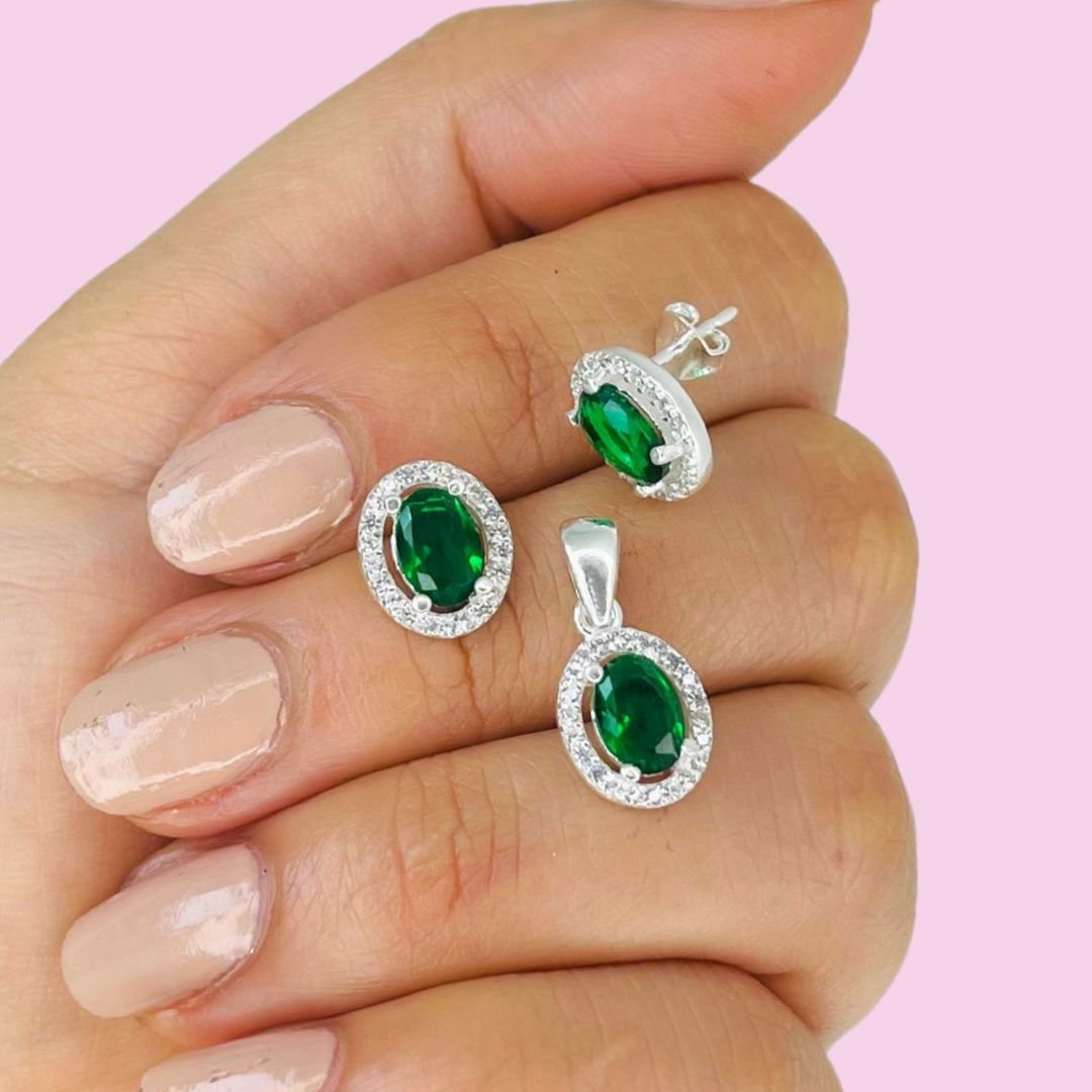 Conjunto Aros y Dije Ovalado Verde Plata Italiana