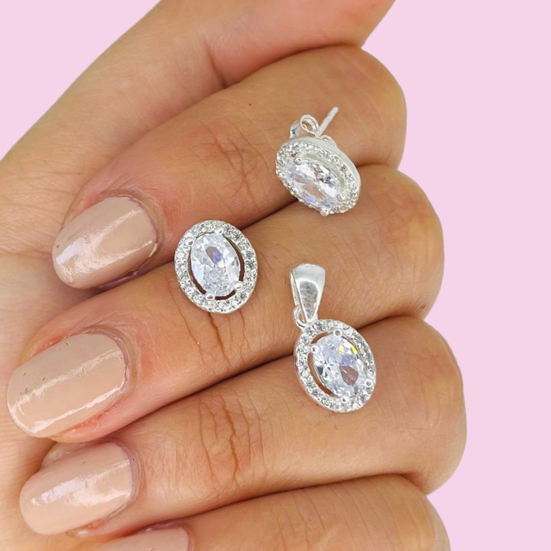 Conjunto Aros y Dije Ovalado Blanco Plata Italiana