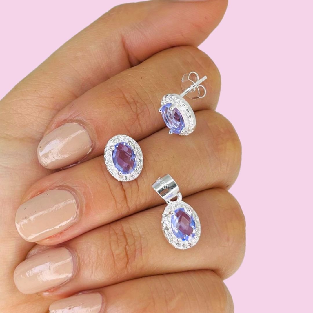 Conjunto Aros y Dije Ovalado Lila Plata Italiana