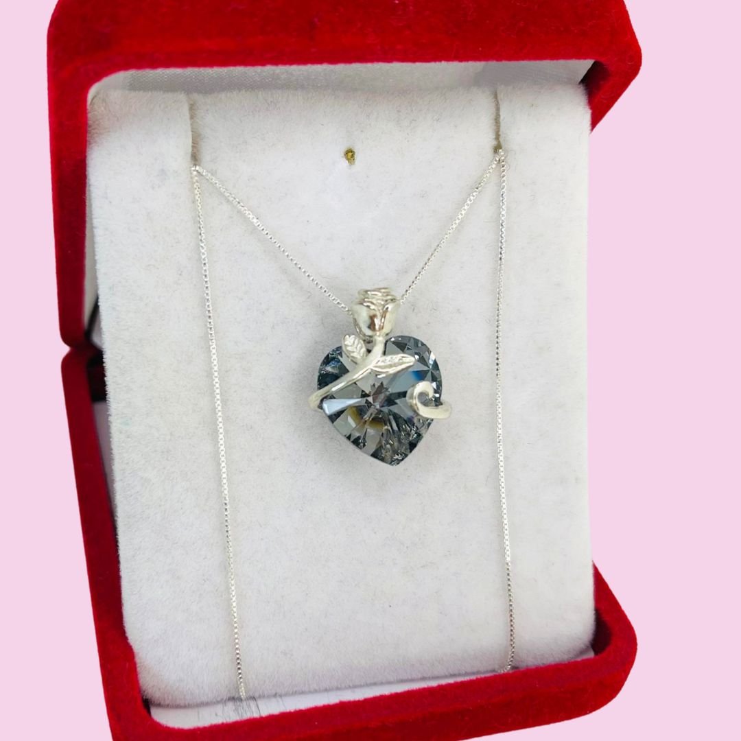 Conjunto Piedra Corazon con rosa engarzada Negro Plata 925