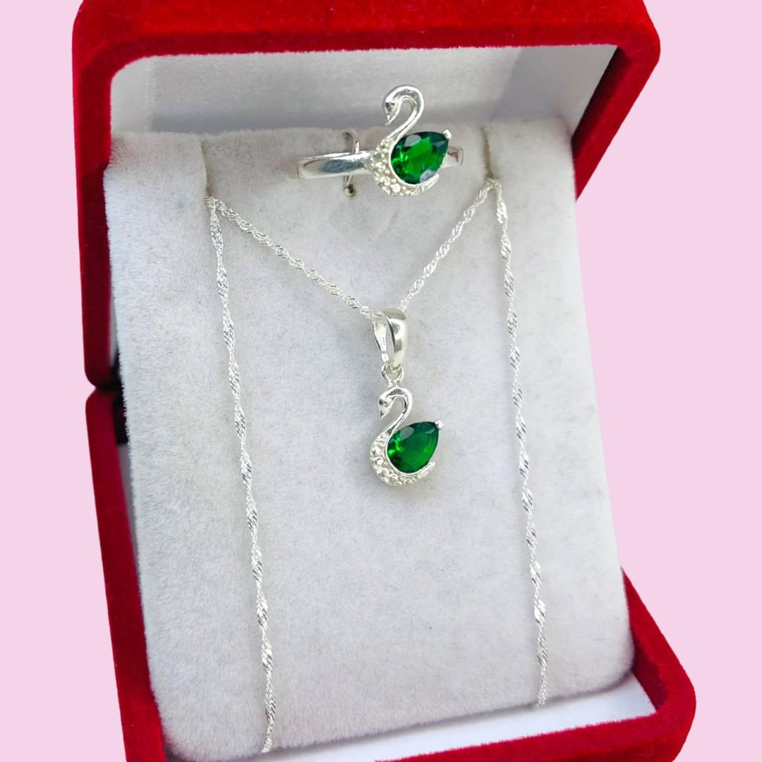 Conjunto Cadena con dije y anillo Cisne Verde Plata 925