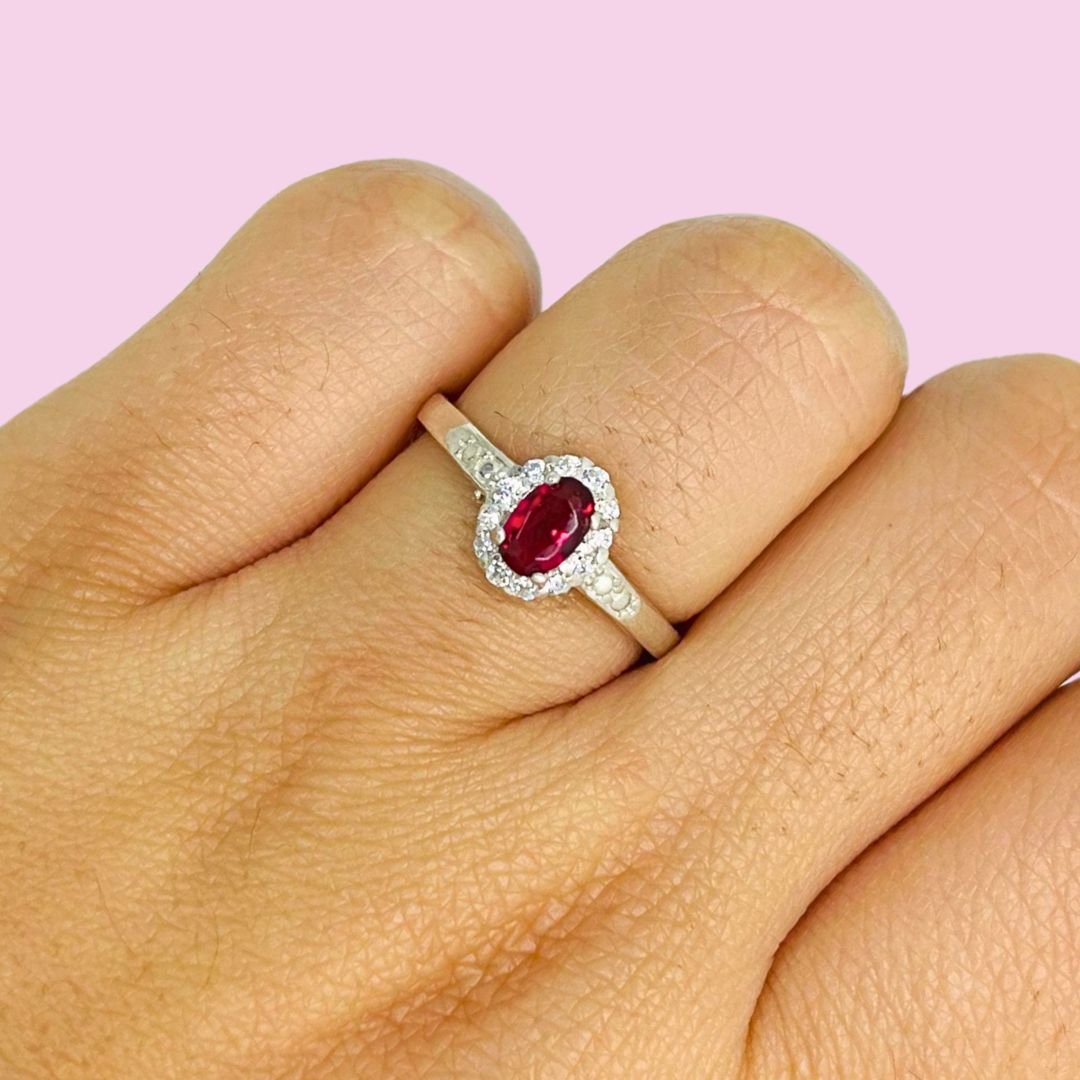 Anillo Halo de piedra Blanco y Fucsia Plata 925
