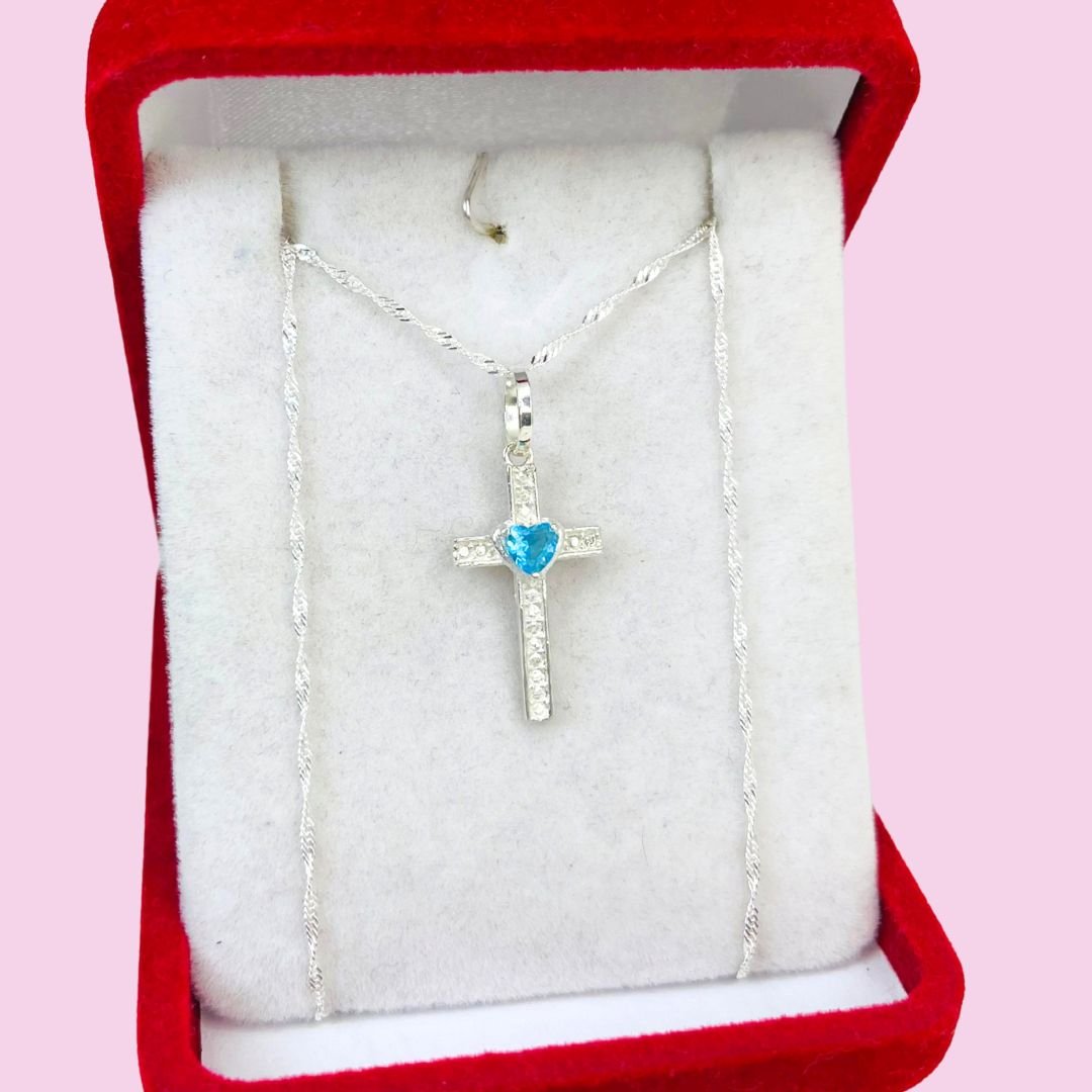 Conjunto Cadena y dije Cruz cubic corazon Aguamarina Plata 925