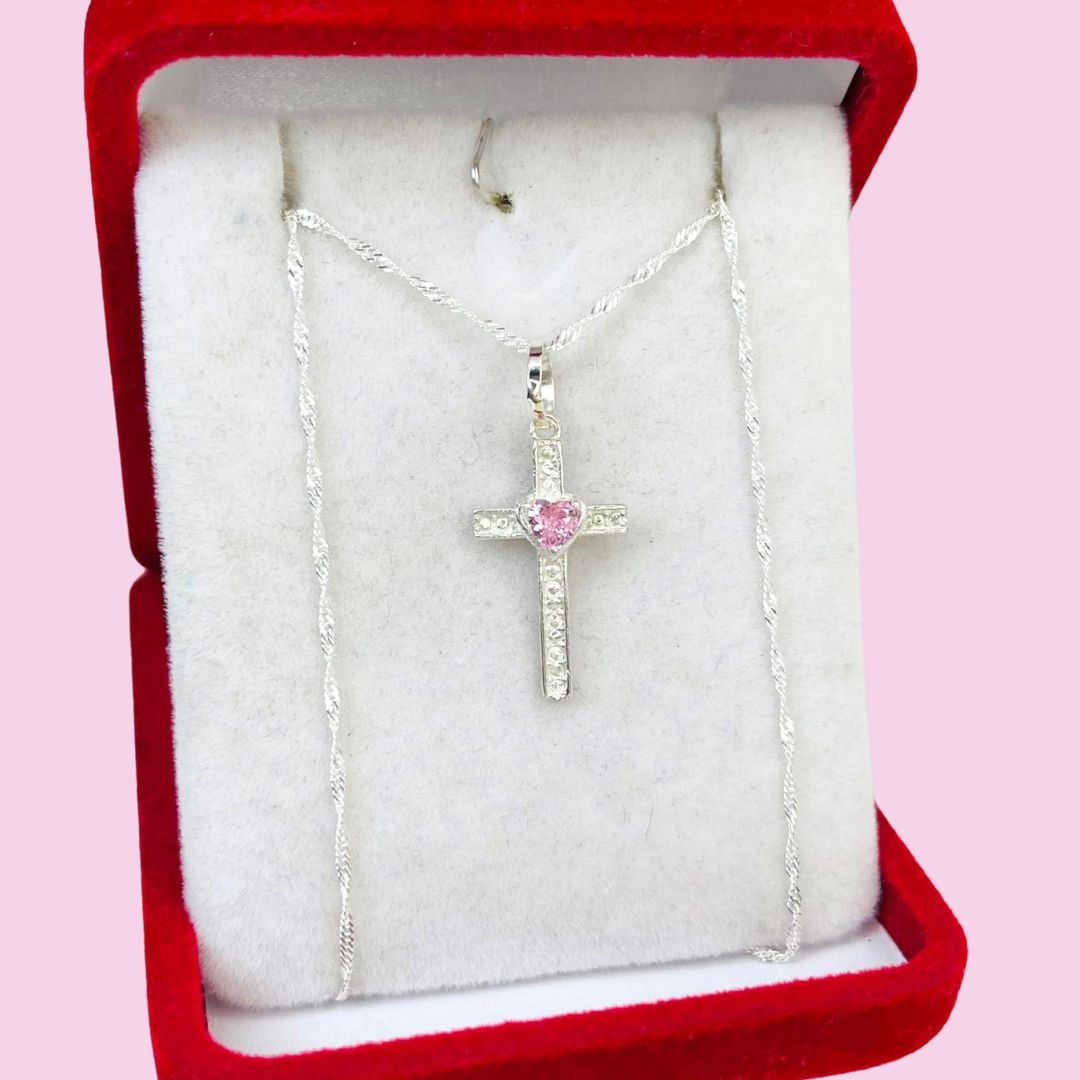 Conjunto Cadena y dije Cruz cubic corazon Rosa Plata 925