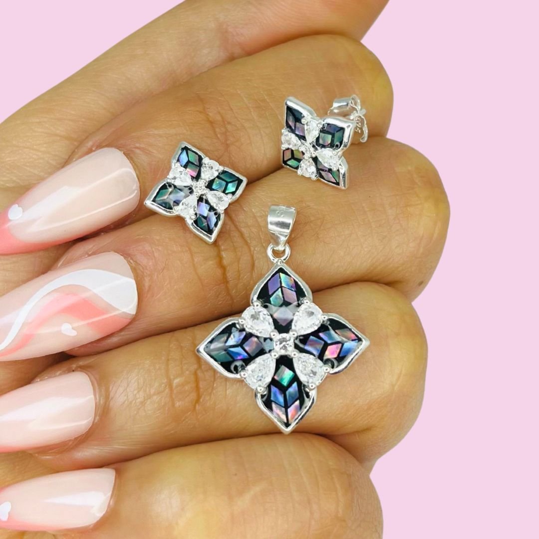 Artículo: KIT 384Conjunto Dije y Aros Trebol Con nacar Plata Italiana