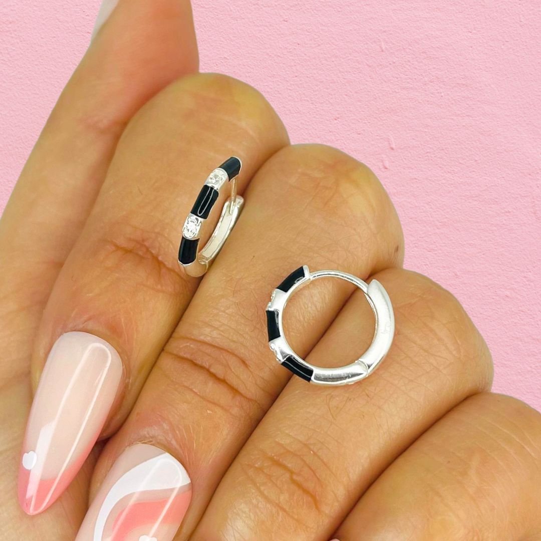 Aros Huggies con esmaltado Negro cubic Plata Italiana