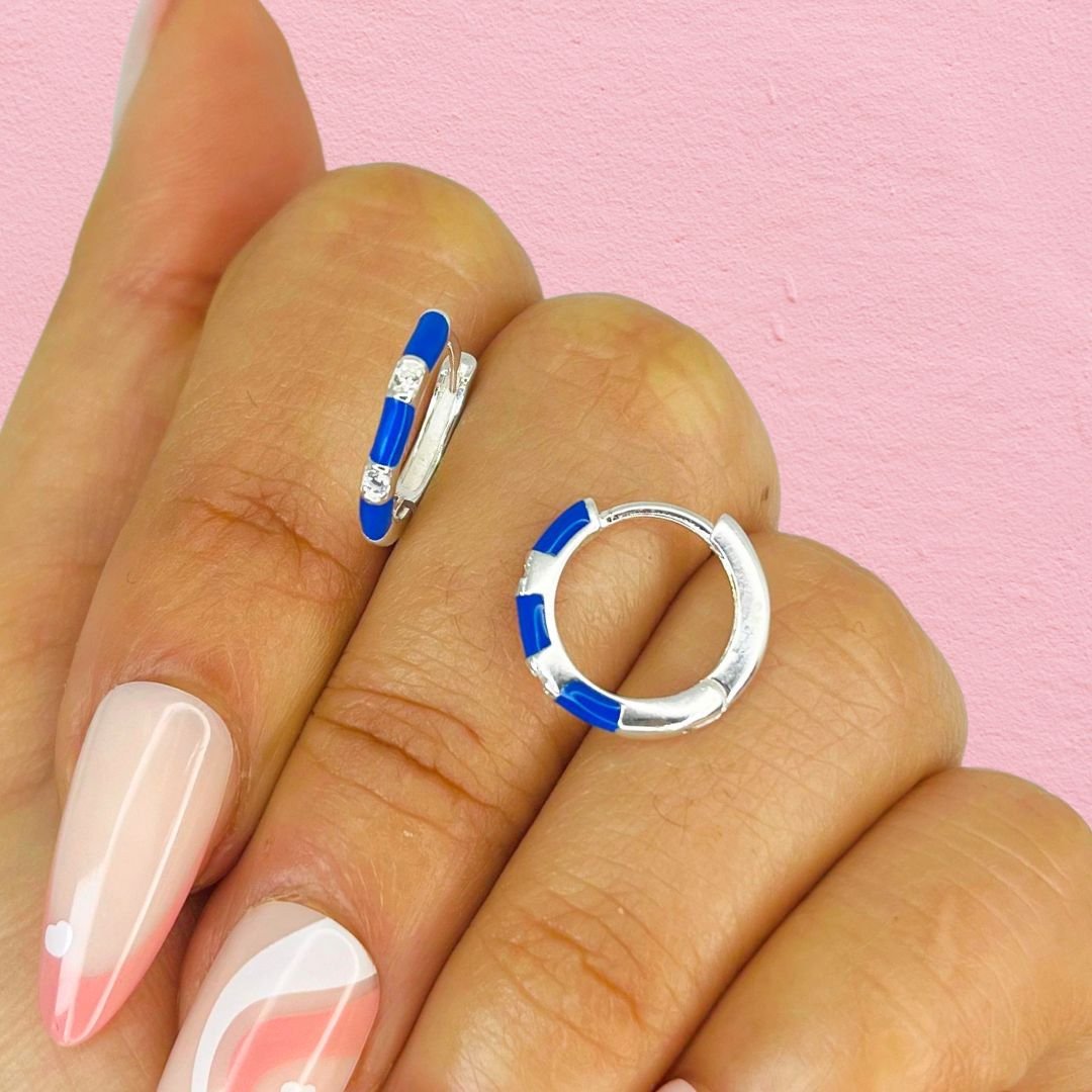 Aros Huggies con esmaltado Azul cubic Plata Italiana