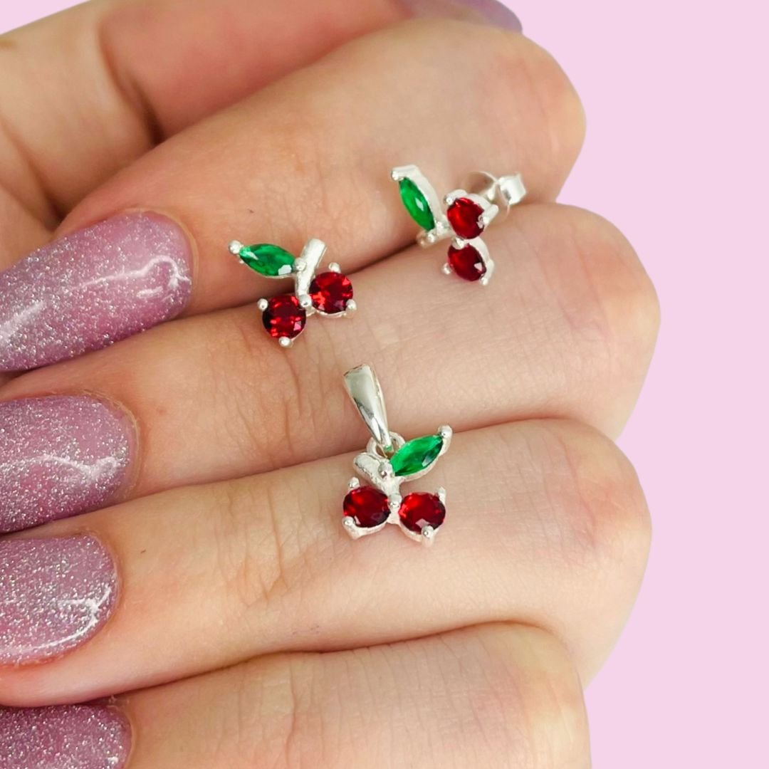 Conjunto Aros y Diije Cereza con cubic Plata 925