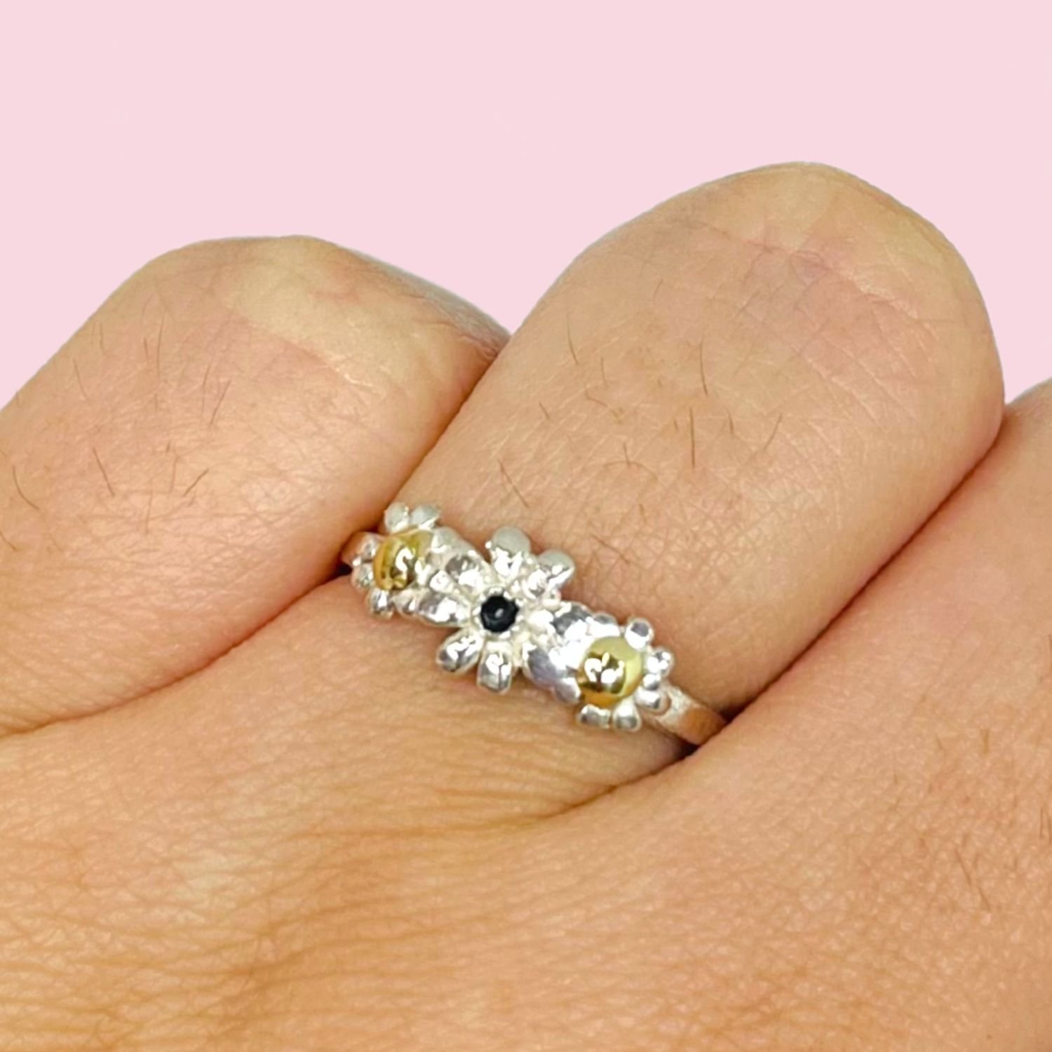 Anillo Margarita trio con cubic Negro Plata 925 y Oro