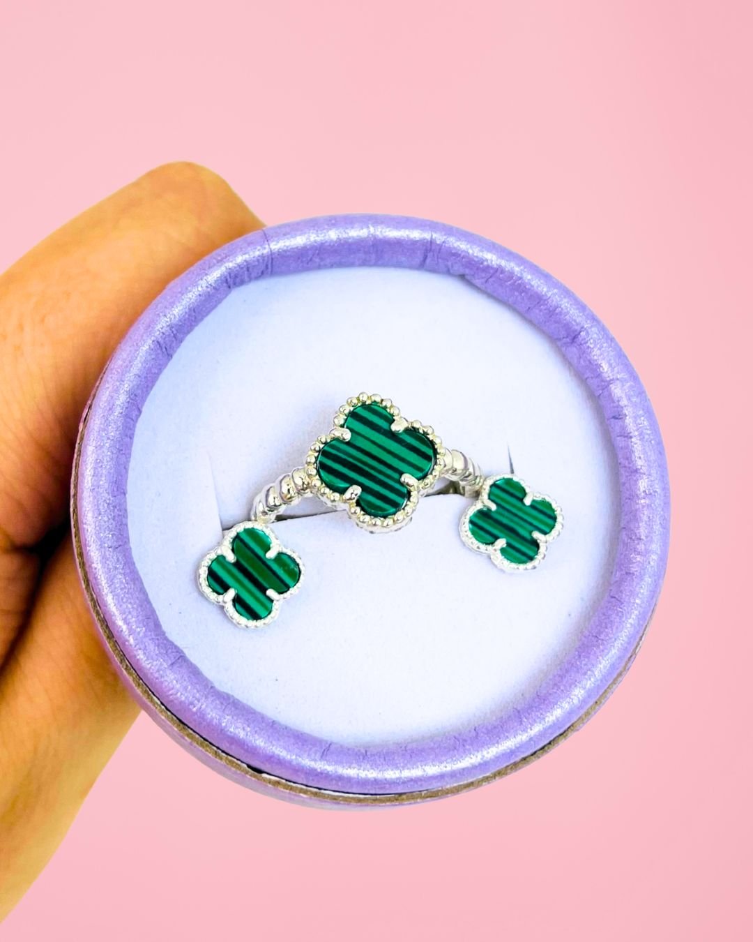 Conjunto Anillo y Aros Van Cleef Malaquita Plata 925
