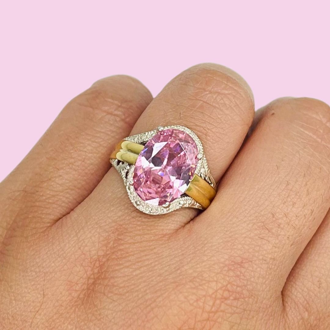 Anillo con cubic ovalado grande rosa de Plata y Oro