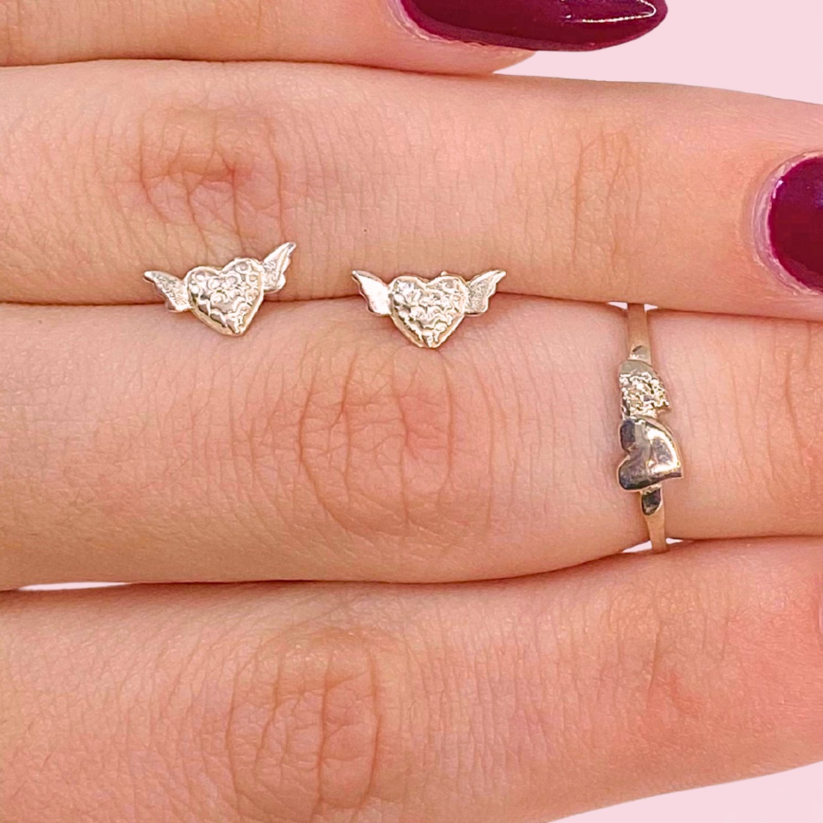 Conjunto Anillo Corazon grande y corazon chico y Aros Corazon de Angel de Plata 925