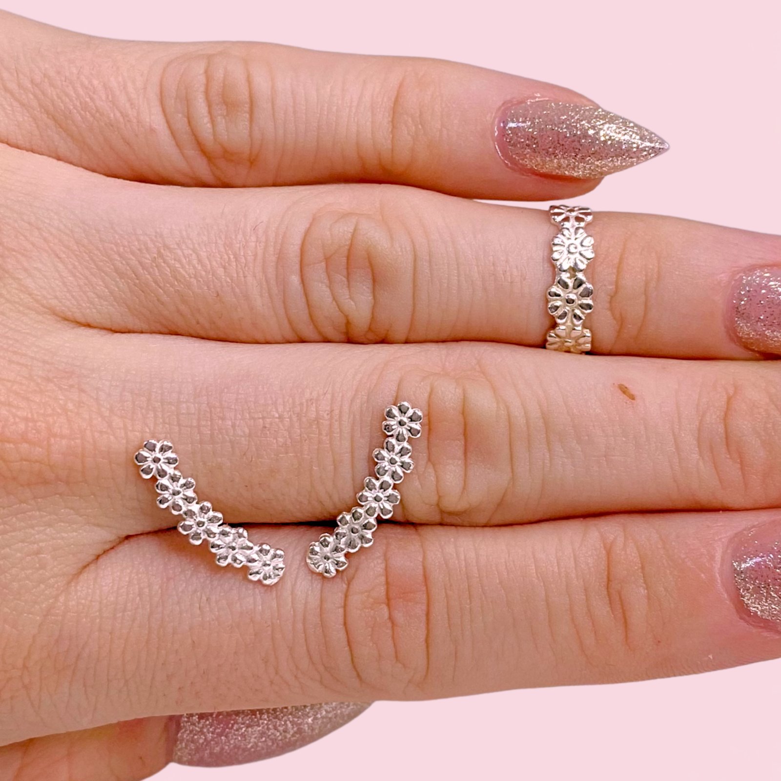 Conjunto Anillo Margaritas para media falange y Aros trepador cinco flores de Plata 925