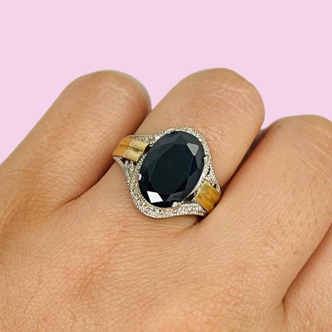 Anillo con cubic ovalado grande Negro de Plata y Oro