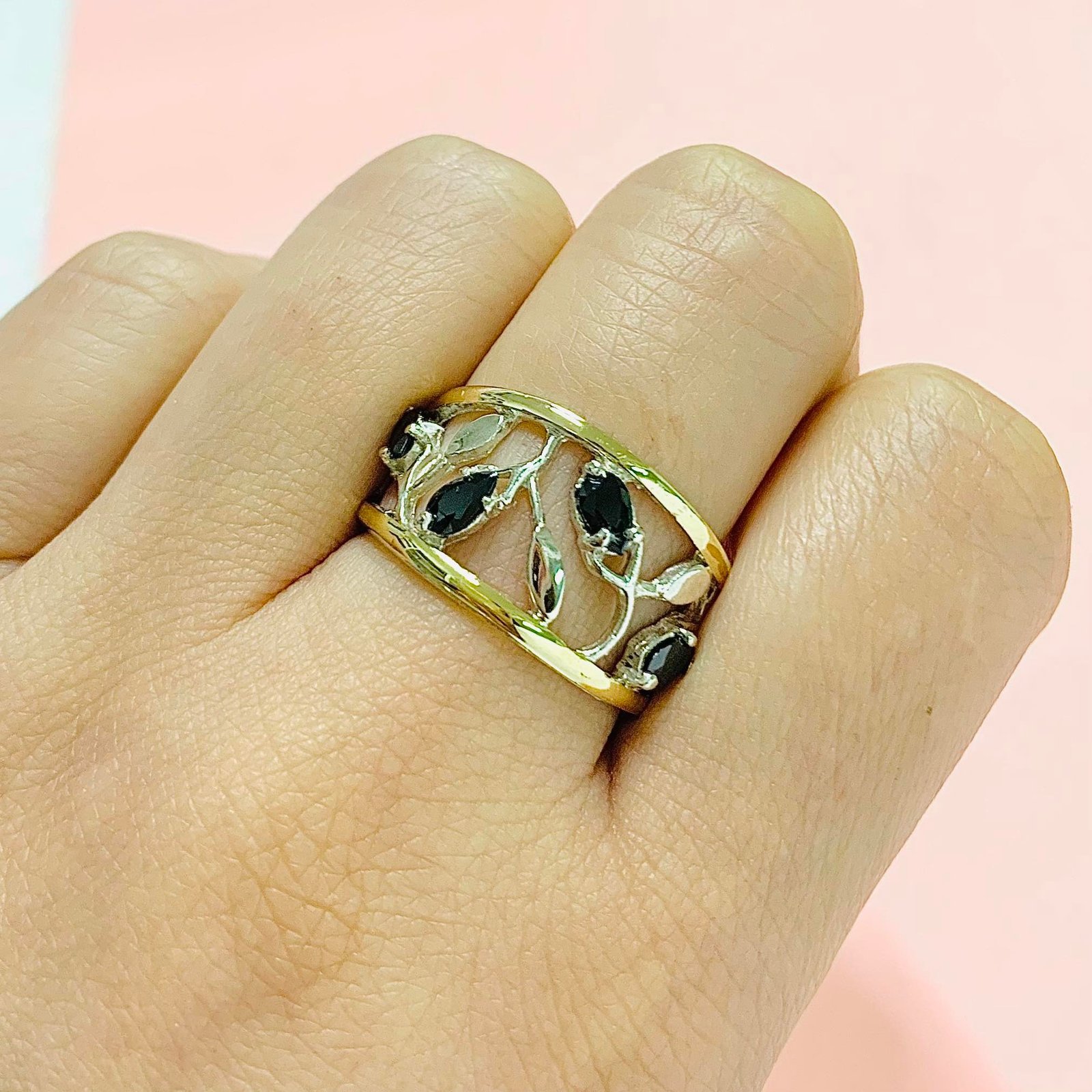 anillo hojas negras de Plata y oro